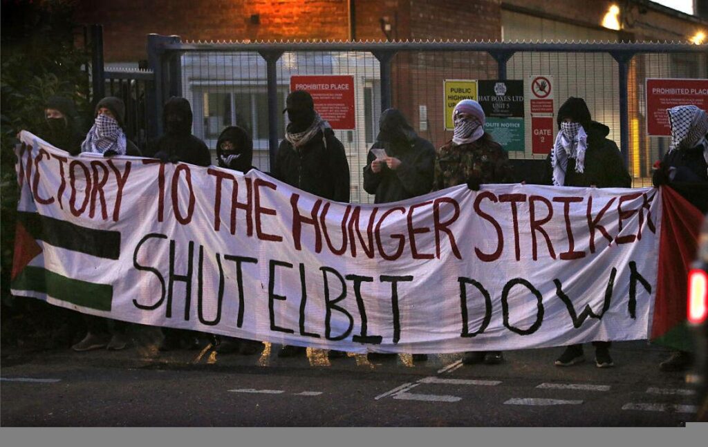 “Our prisoners hunger strike will be remembered as a larendmark moment of pure defiance; an embarrassment for the British state. It exposed to the world Britain has political prisoners in service of a foreign genocidal regime, and has seen hundreds of people commit to take direct action in the prisoners footsteps.