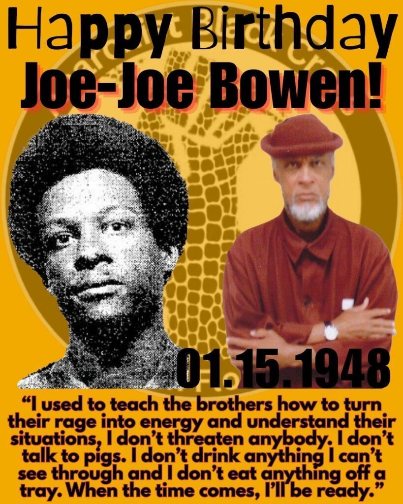 “Joe-Joe” Bowen is a Black Liberation Army (BLA) Prisoner of War, serving two life sentences for the assassination of a prison warden and deputy warden, as well as an attempted prison break which resulted in a five-day standoff after his initial arrest.