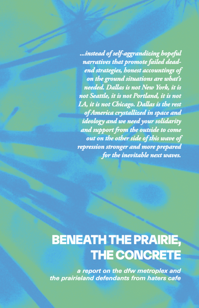 A new Haters Cafe zine “Beneath the Prairie, the Concrete” gives updates on the Prarieland Defendants and the local political context surrounding the ICE detention center outside Dallas Fort Worth.