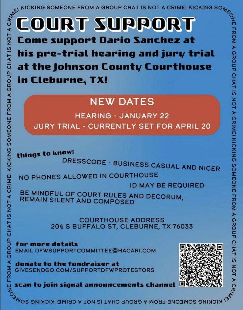 As always, you can donate to the Support Committee’s efforts at https://www.givesendgo.com/supportDFWprotestors